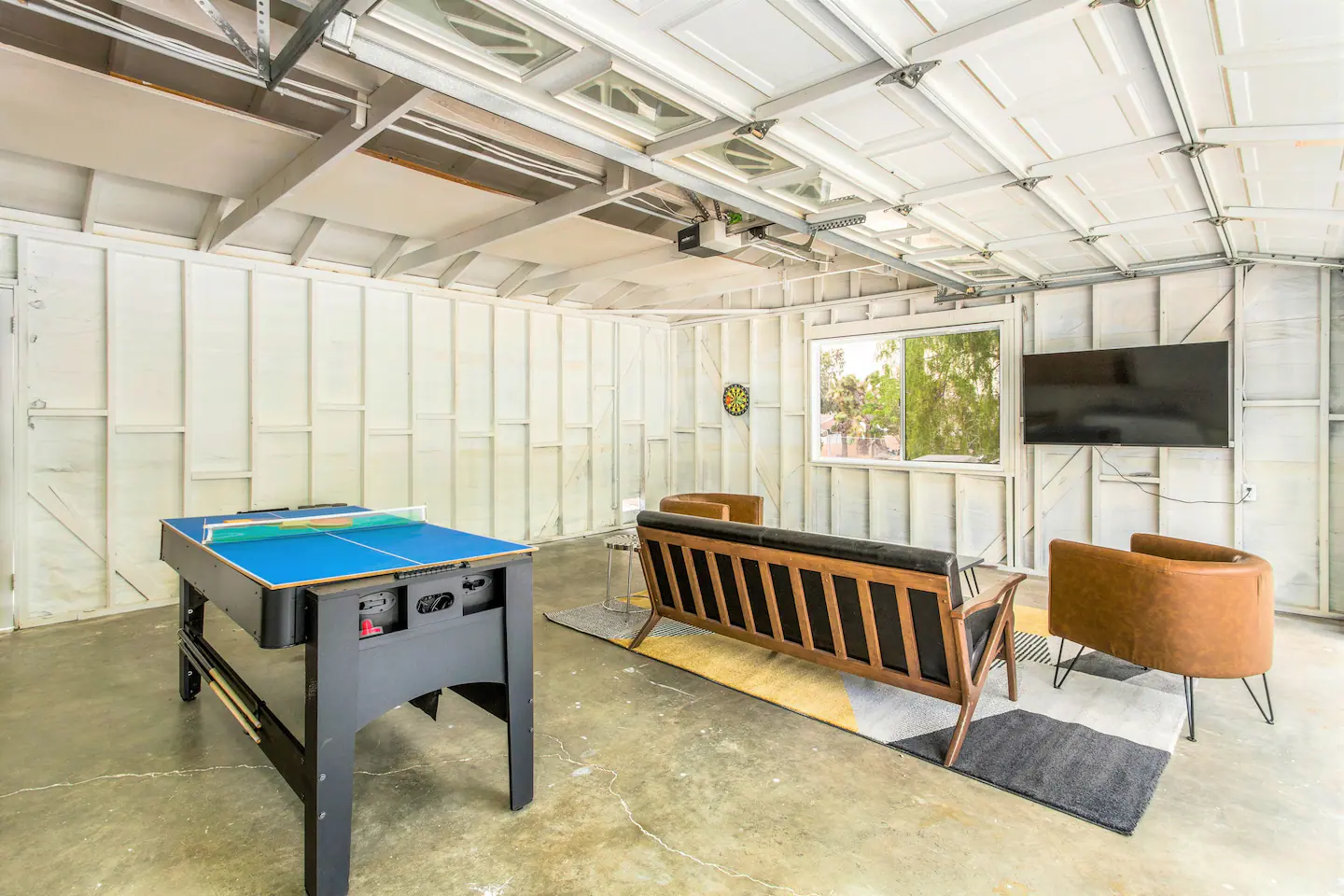 The GameRoom is located in the garage. Includes a spot to hang out, watch TV, play games (3-in-1 3-in-1 Pool table, Ping Pong table, & Air hockey table). Guests will also enjoy the yoga equipment provided.
